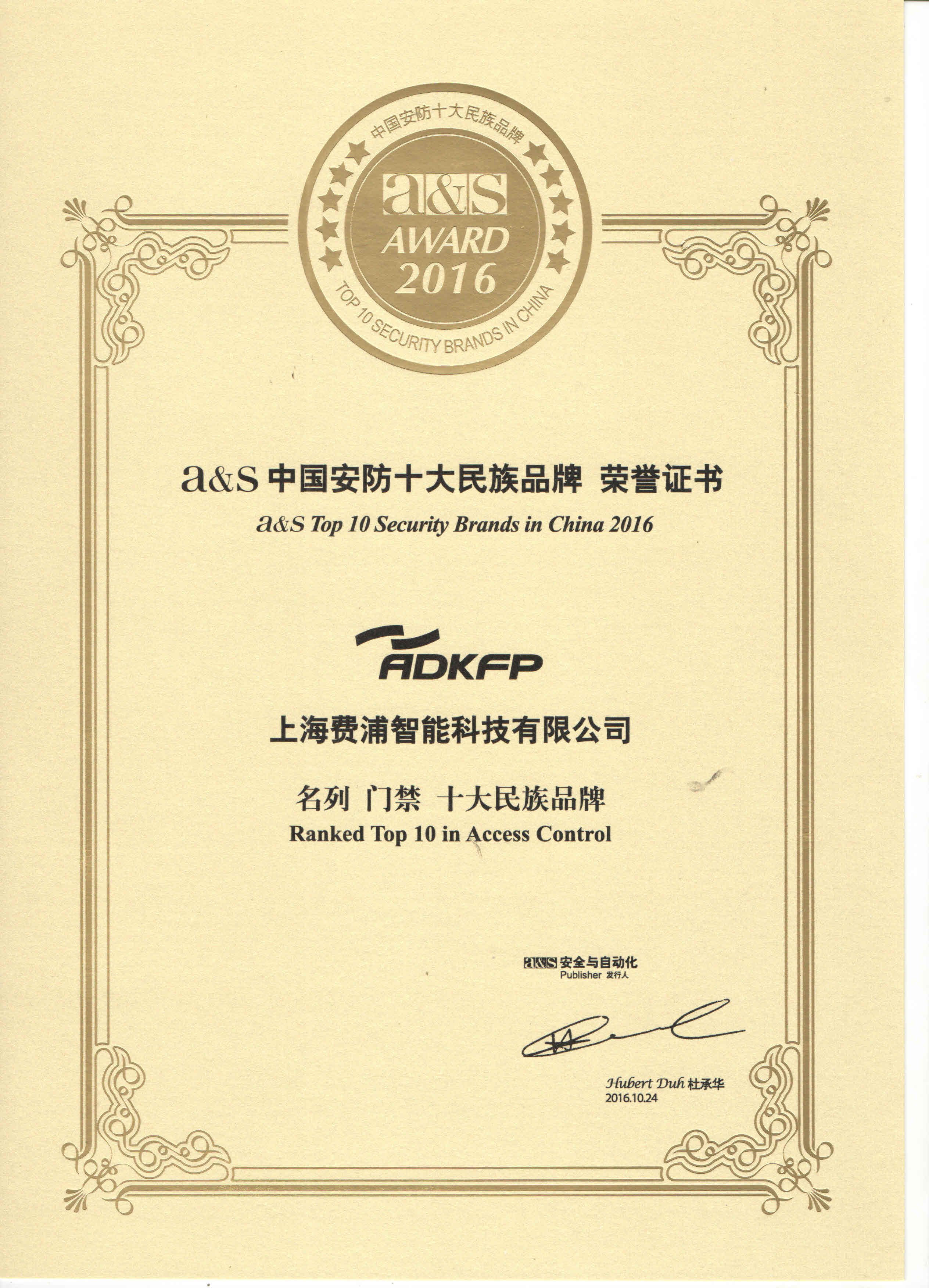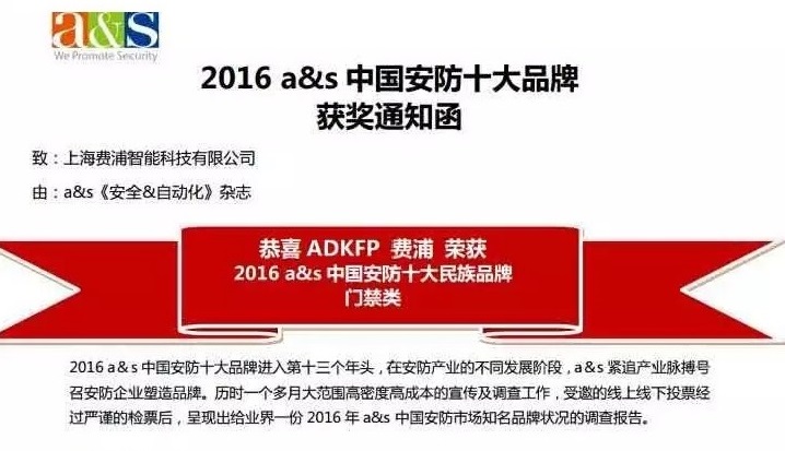 恭喜ADKFP 費浦 榮獲2016 a&s 中國安防十大民族品牌門禁類