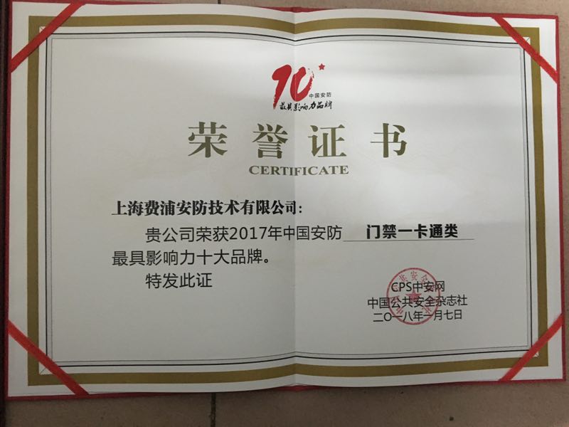 年底是收獲的季節(jié),費(fèi)浦安防喜訊不斷。2018年1月7日,一年一度的全國安防界迎春團(tuán)拜會在深圳世界之窗凱撒宮隆重舉行,上海費(fèi)浦安防技術(shù)有限公司再獲殊榮,獲得"2017年中國安防門禁一卡通類最具影響力十大品牌"的榮譽(yù)。