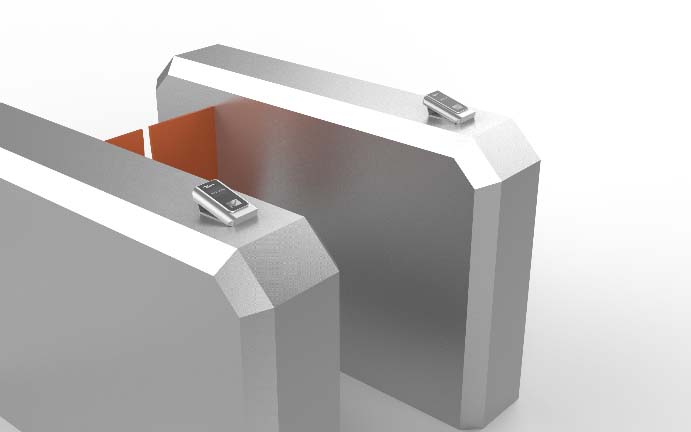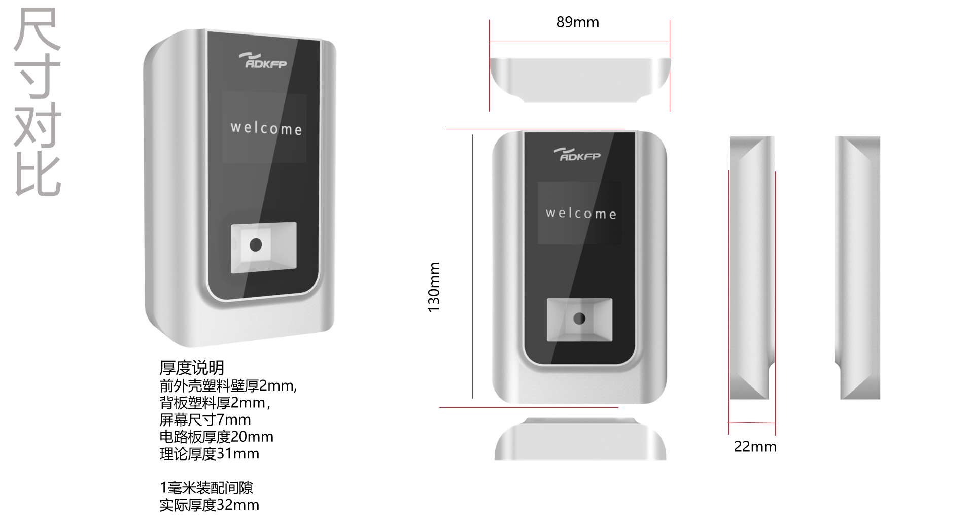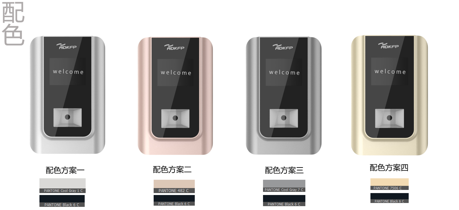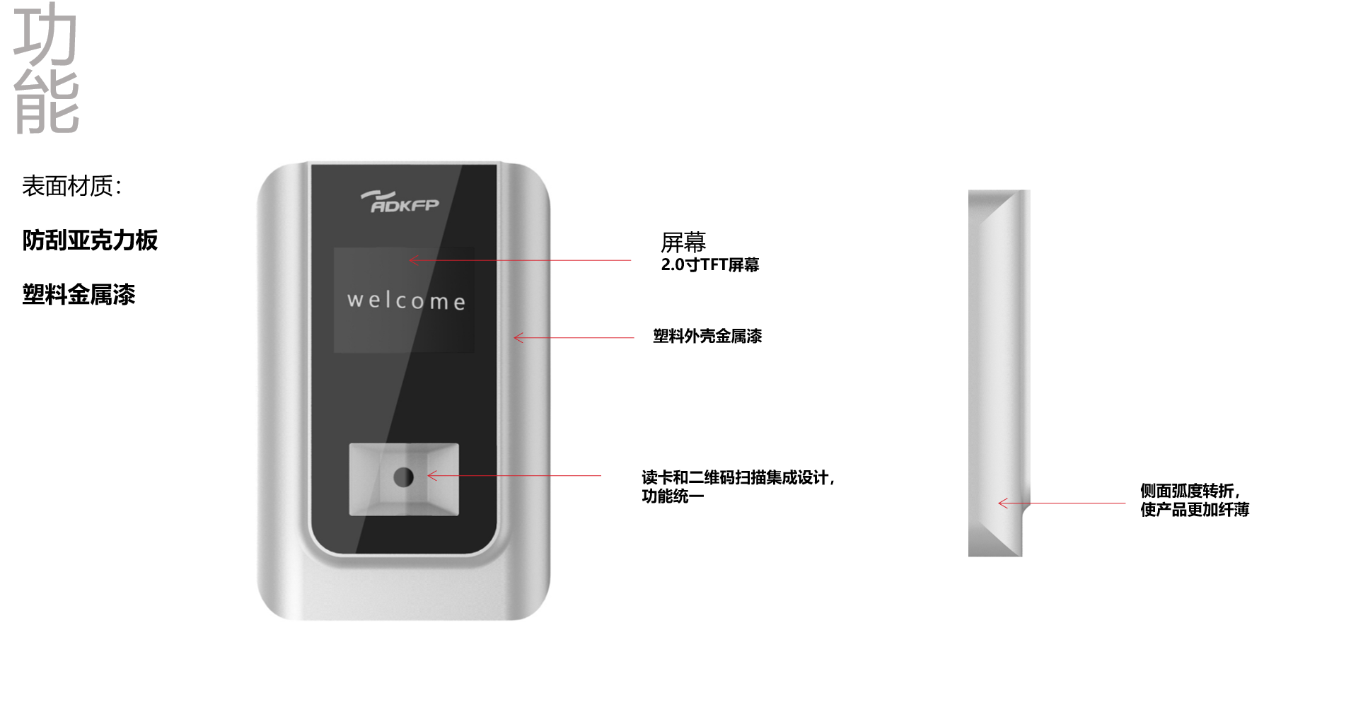 在CMF材料工藝的選擇上采用模出塑料外殼噴金屬漆,這與光面的亞克力板形成了強烈的視覺材質(zhì)對比,增加產(chǎn)品的造型感。同樣側(cè)面弧度轉(zhuǎn)角在視覺上使得本款門禁更加纖薄。